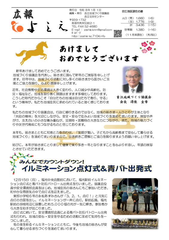 「高齢者福祉・子育て支援の充実」「賑わいの創出」「生活環境の改善」を中心に取り組み、子供から高齢者まですべての人が生きがいを感じられ、安心で安全に暮らしていく事が出来る社会、そして活力ある自治組織を目指し、地域の活動や課題にきめ細かく取り組み、協議会は吉江地区の皆さんとしっかりスクラムを組んで、福祉、地域社会の向上に取り組みます。